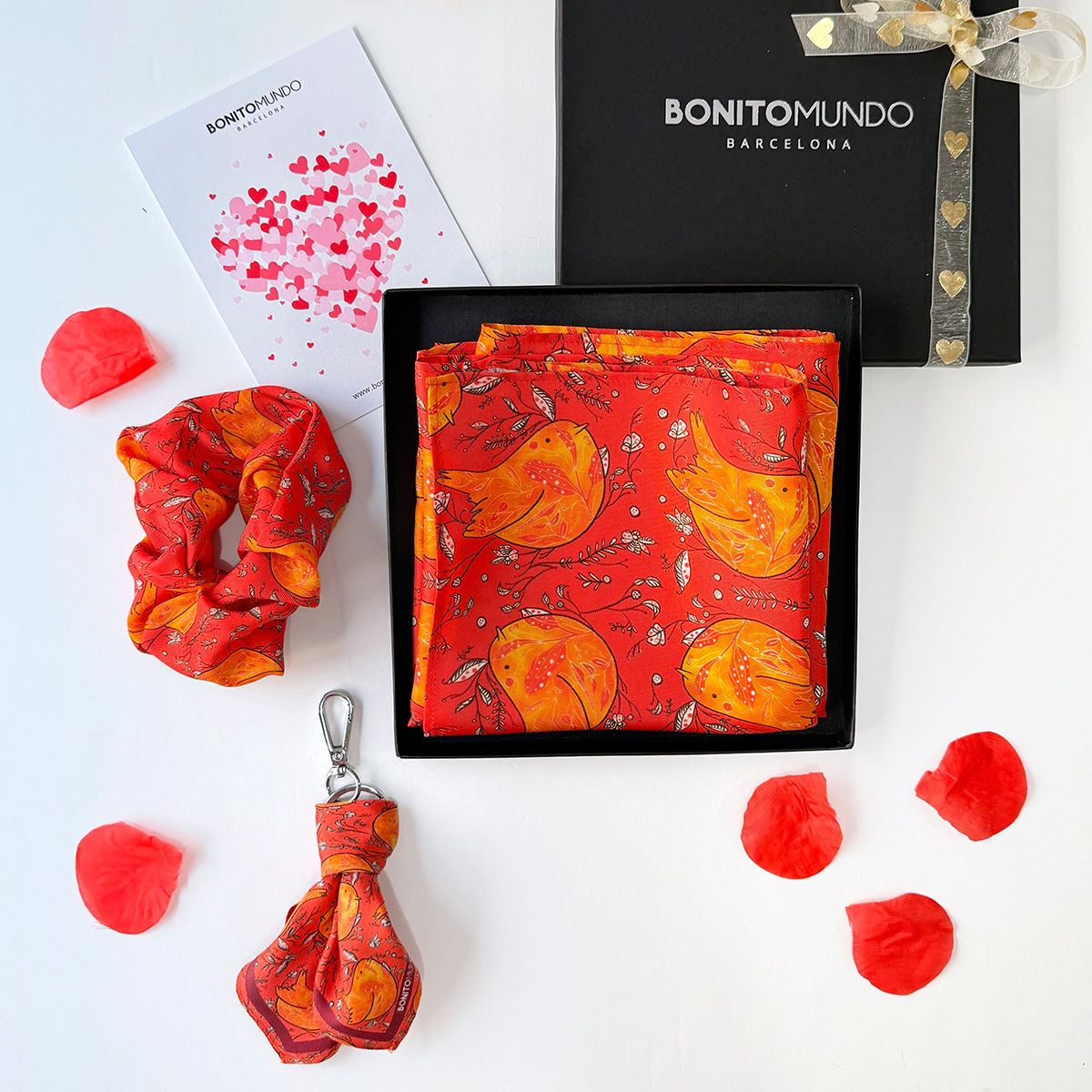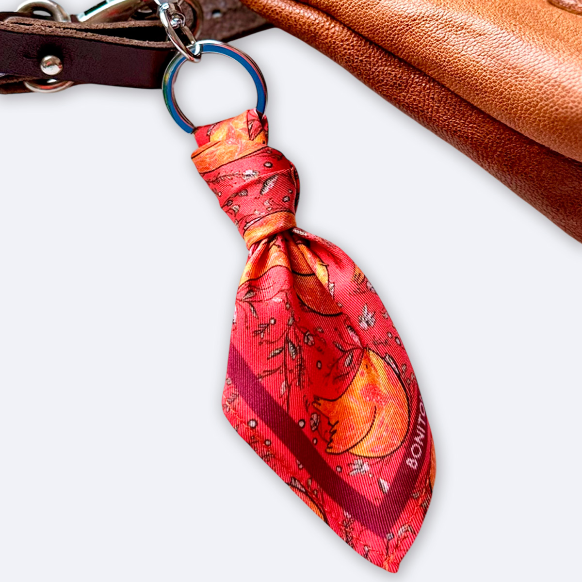 El pañuelo de seda Free Spirit de 70×70 cm en vibrantes tonos rojos, junto con el coletero y charm a juego, crean un conjunto armonioso que irradia sofisticación y personalidad.