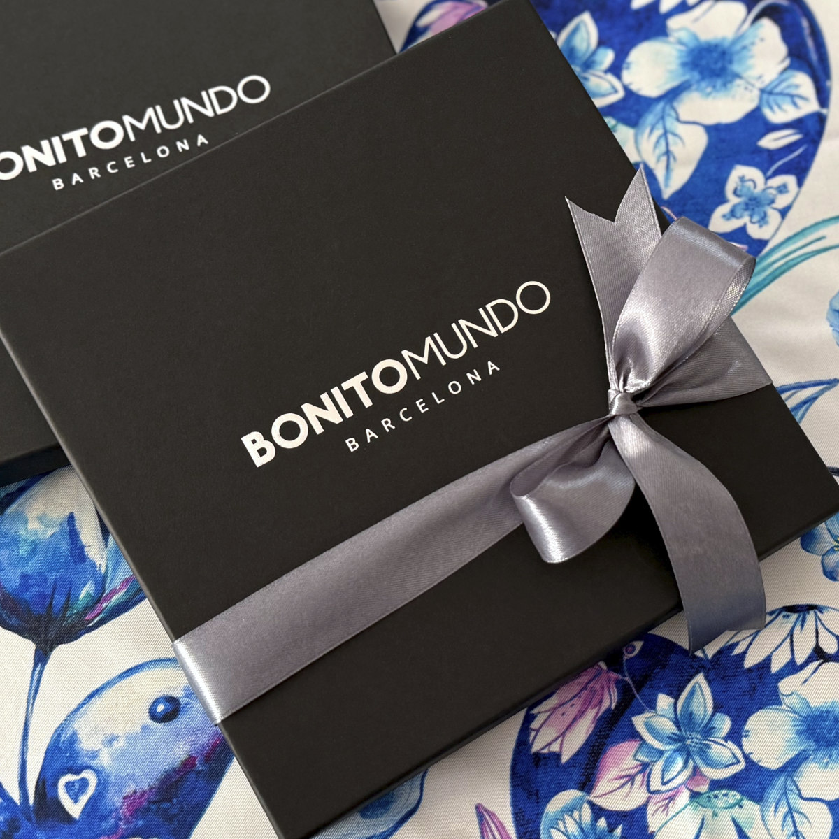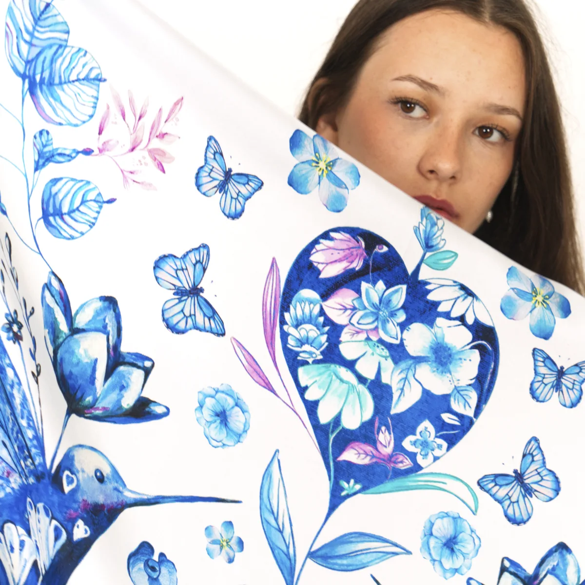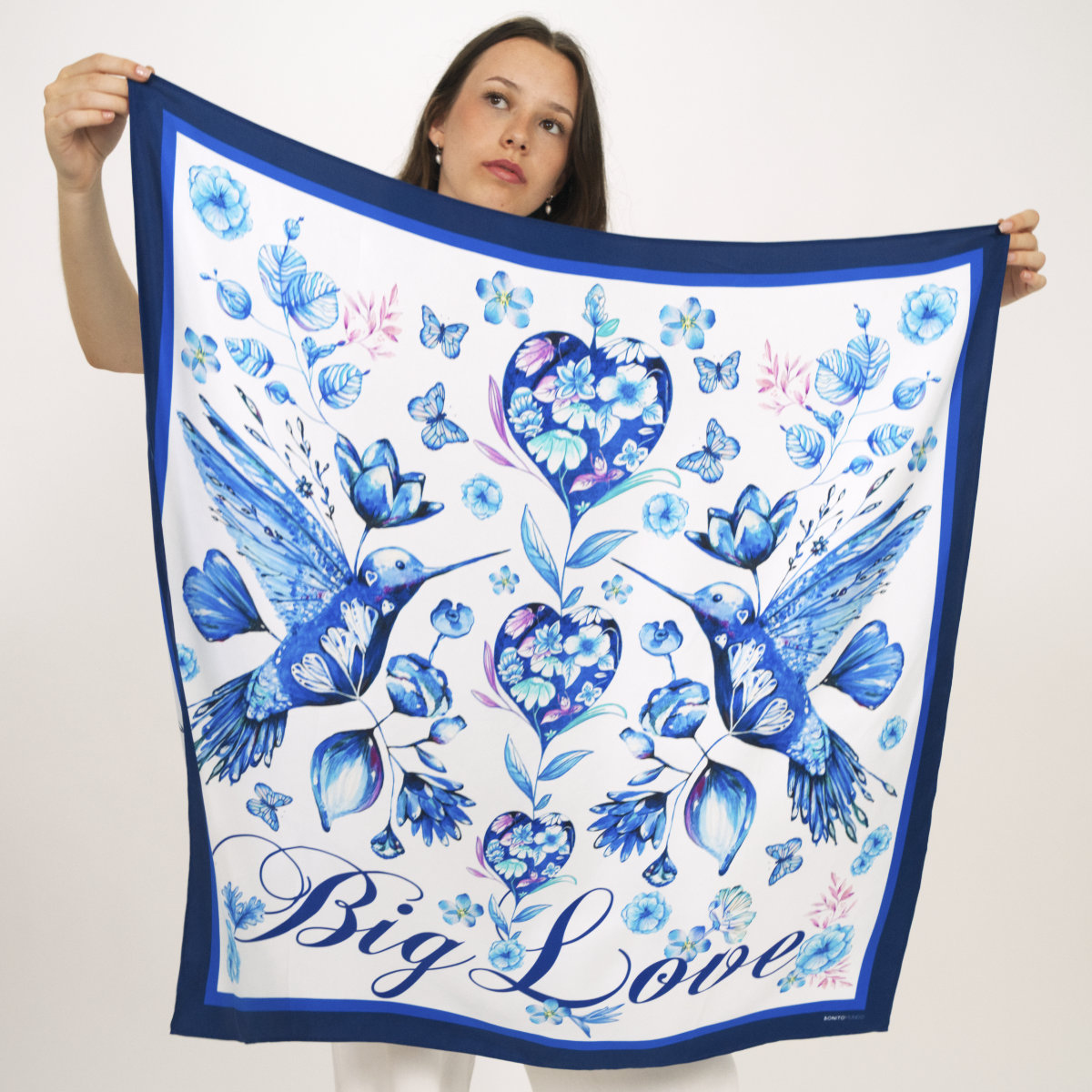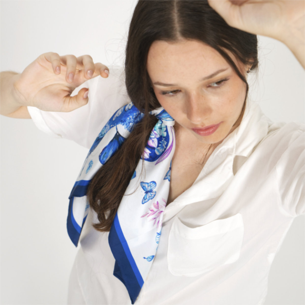 pañuelo de seda con arte abstracto en tonos turquesa que recuerdan a flores
